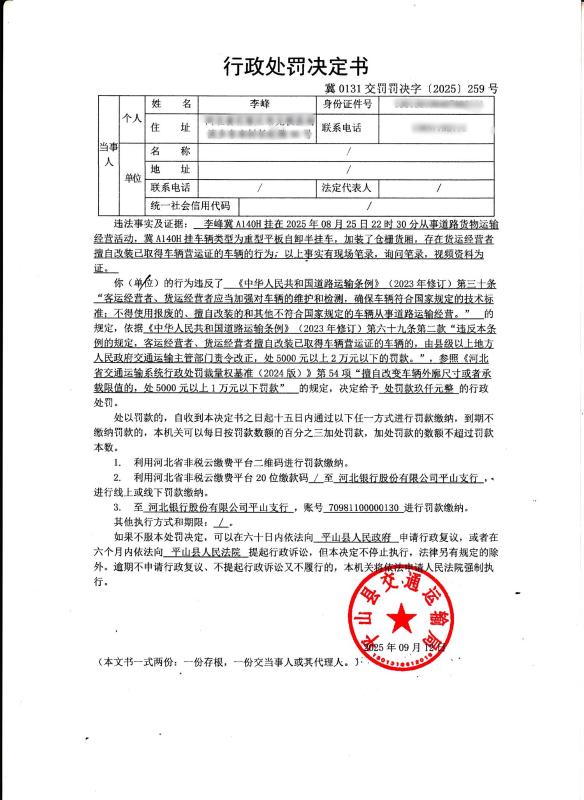 李峰货运经营者擅自改装已取得车辆营运证的车辆的行为,冀0131交罚罚决字【2025】259号