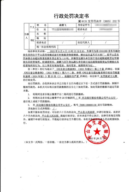 康鹏飞货运源头单位放行违法超限超载货运车辆驶出其经营场所的行为,冀0131交罚罚决字【2025】232号