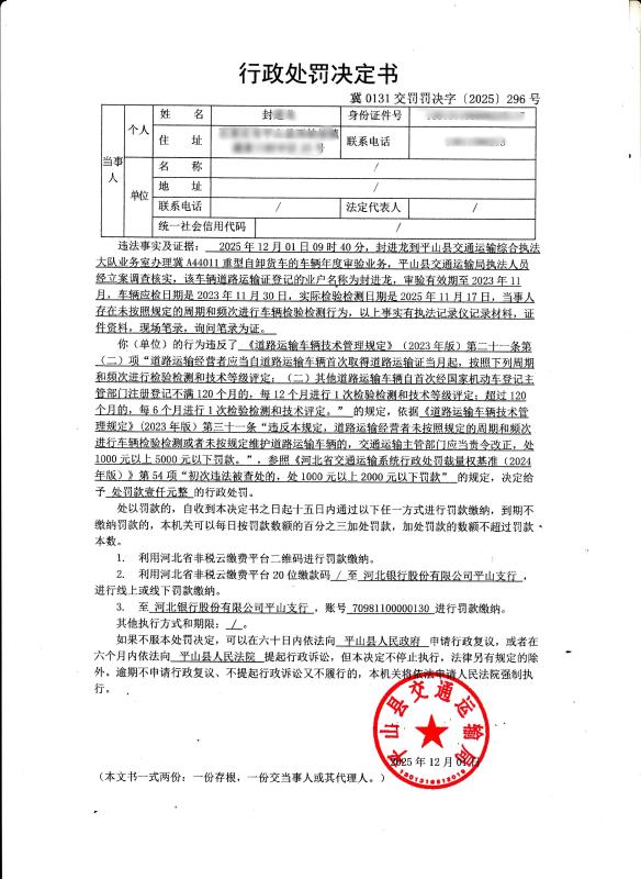 封进龙当事人存在未按照规定的周期和频次进行车辆检验检测行为,冀0131交罚罚决字【2025】296号