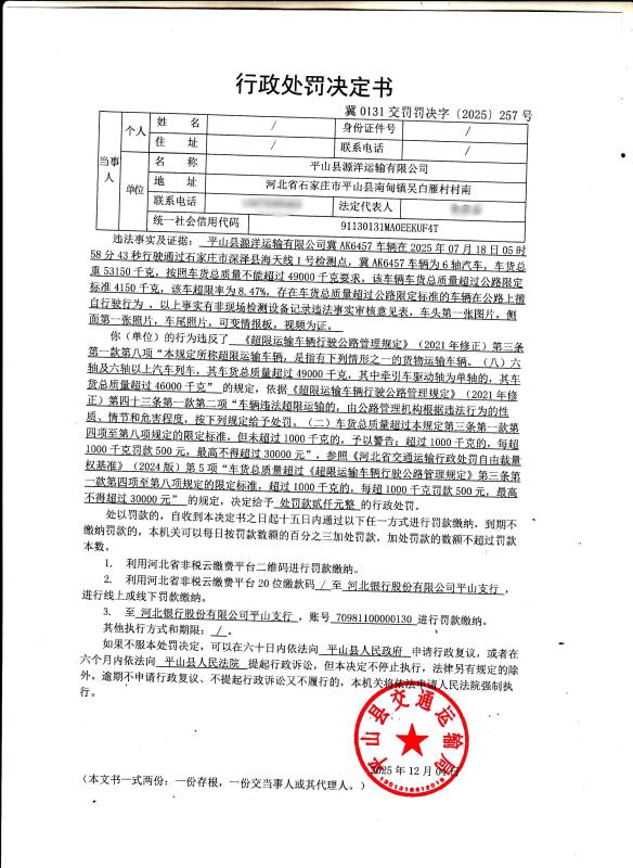 平山县源洋运输有限公司车货总质量超过公路限定标准的车辆在公路上擅自行驶冀0131交罚罚决字【2025】257号案