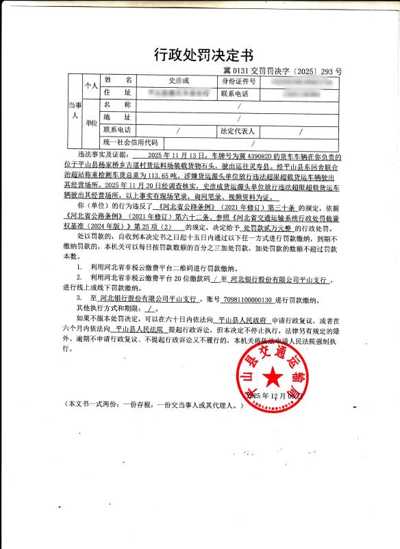 史彦成货运源头单位放行违法超限超载货运车辆驶出其经营场所冀0131交罚罚决字【2025】293号