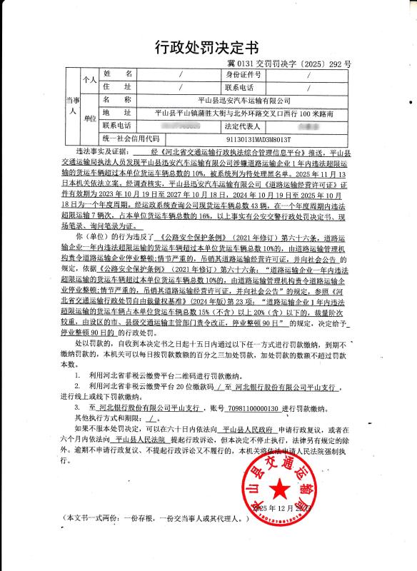 平山县迅安汽车运输有限公司涉嫌道路运输企业1年内违法超限运输的货运车辆超过本单位货运车辆总数的%10的行为,冀0131交罚罚决字【2025】292号