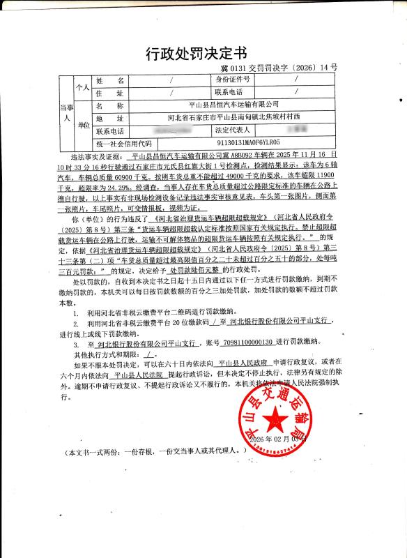 平山县昌恒汽车运输有限公司车货总质量超过公路限定标准的车辆在公路上擅自行驶冀0131交罚罚决字【2026】14号