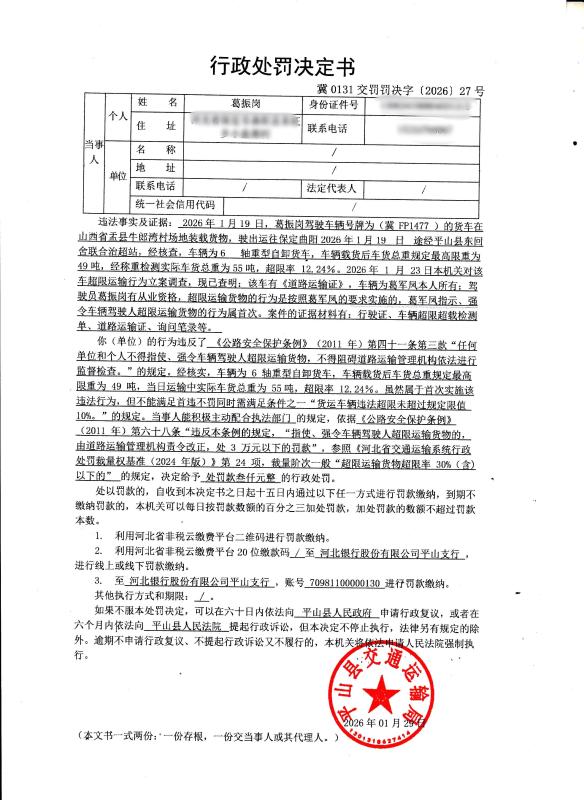 葛振岗指使、强令车辆驾驶人超限运输货物冀0131交罚罚决字【2026】27号