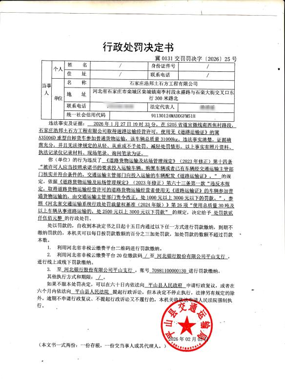 石家庄浩邦土石方工程有限公司取得道路运输经营许可使用无道路运输证的车辆参加普通货物运输冀0131交罚罚决字【2026】25号