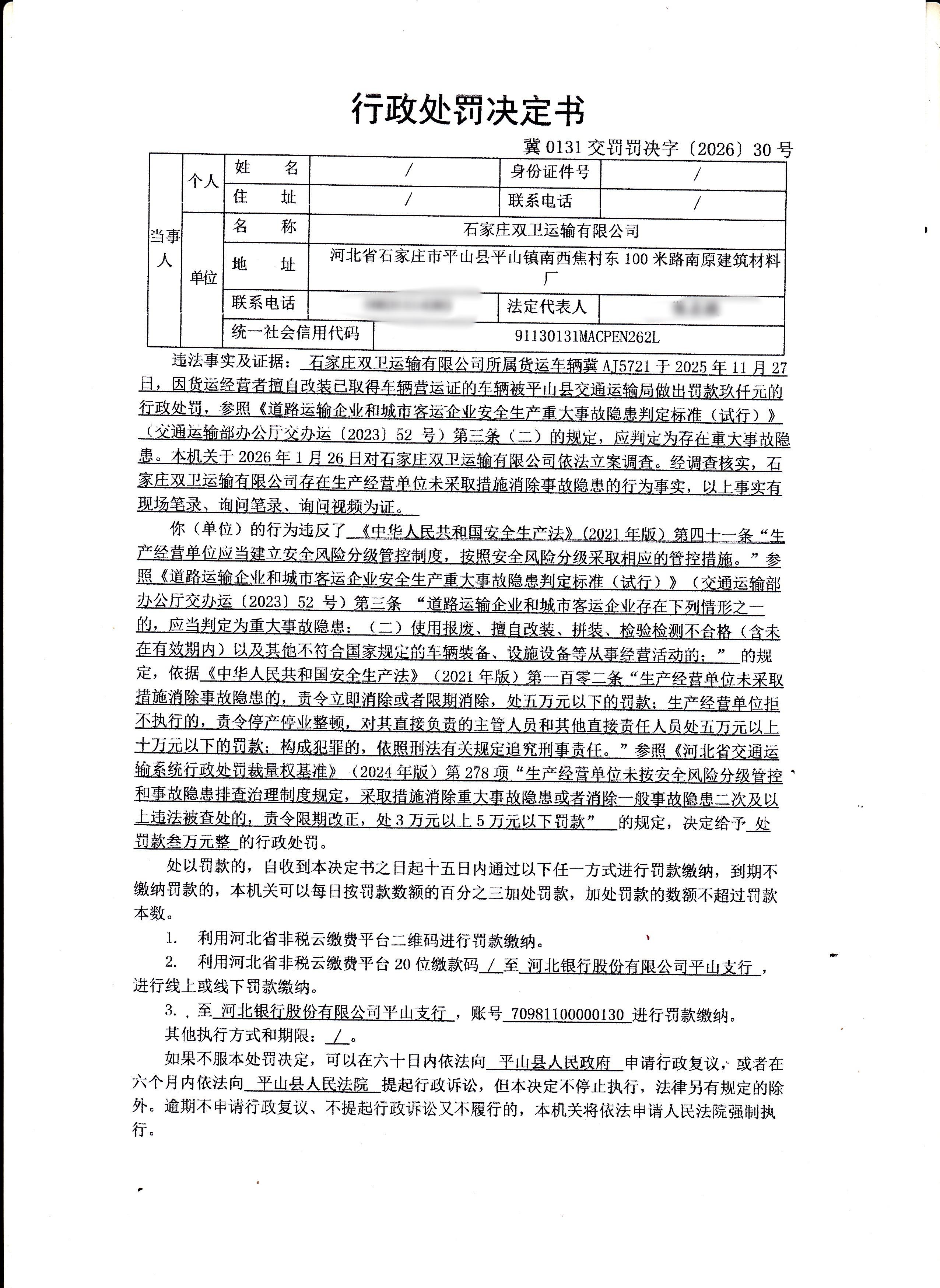 石家庄双卫运输有限公司生产经营单位未采取措施消除事故隐患冀0131交罚罚决字【2026】30号