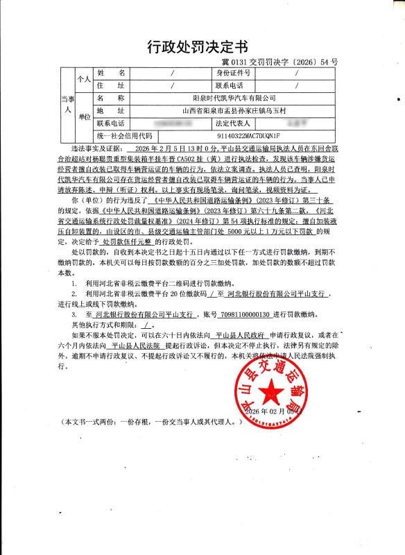 阳泉时代凯华汽车有限公司擅自改装已取得车辆营运证的车辆冀0131交罚罚决字【2026】54号