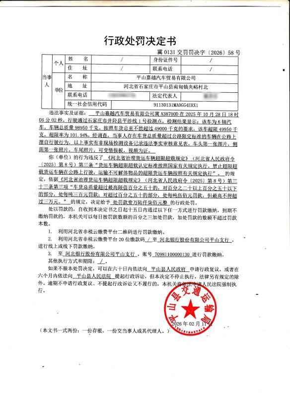 平山县嘉越汽车贸易有限公司车货总质量超过公路限定标准的车辆在公路上擅自行驶冀0131交罚罚决字﹝2026﹞58号