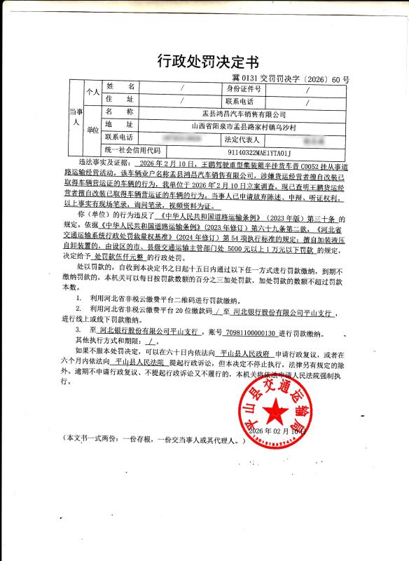 盂县鸿昌汽车销售有限公司货运经营者擅自改装已取得车辆营运证的车辆冀0131交罚罚决字﹝2026﹞60号