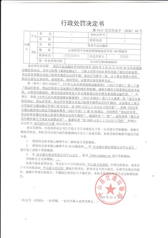 祁县丰运运输队货运经营者擅自改装已取得车辆营运证的车辆案冀0131交罚罚决字【2026】66号