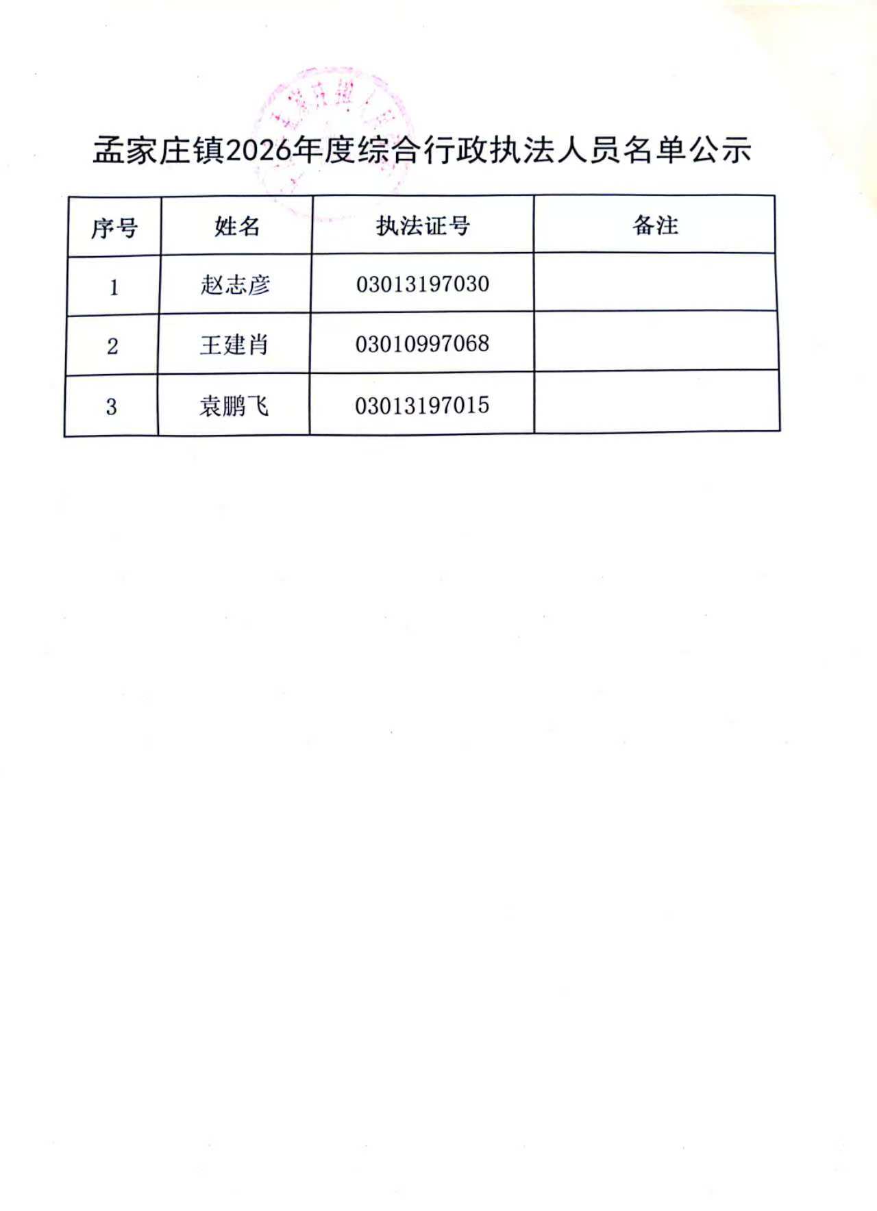 孟家庄镇2026年综合行政执法人员名单公示