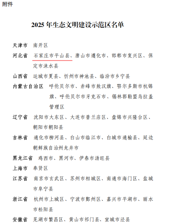 12月25日,国家生态环境部对105个2025年生态文明建设示范区和91个“绿水青山就是金山银山”实践创新基地进行了授牌,平山县荣膺“国家生态文明建设示范区”。