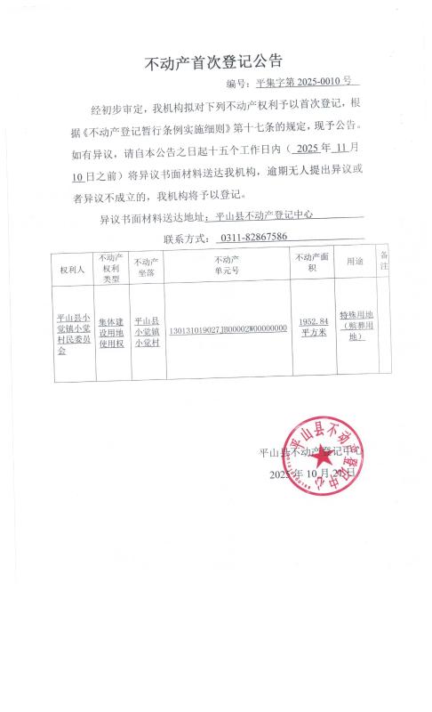 关于平山县小觉镇小觉村民委员会办理集体建设土地使用权首次登记