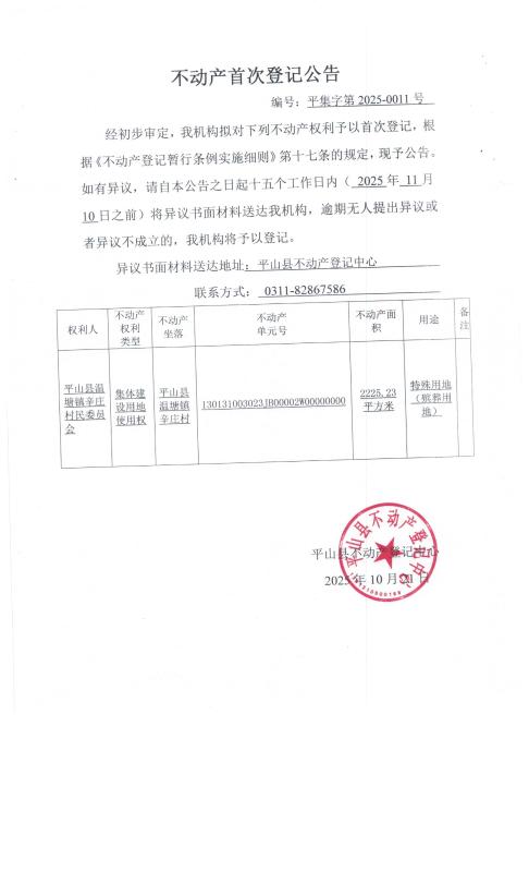 关于平山县温塘镇辛庄村民委员会办理集体建设土地使用权首次登记