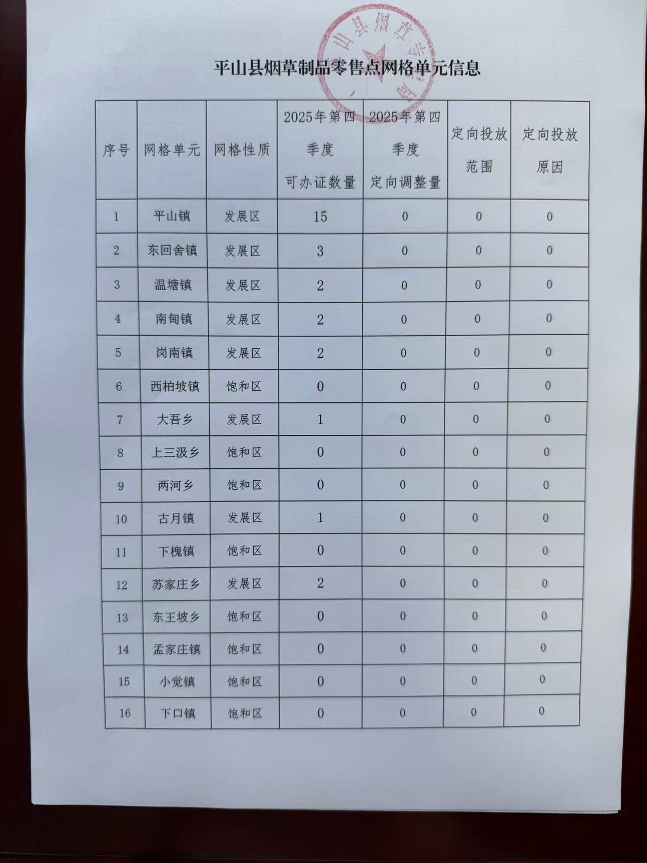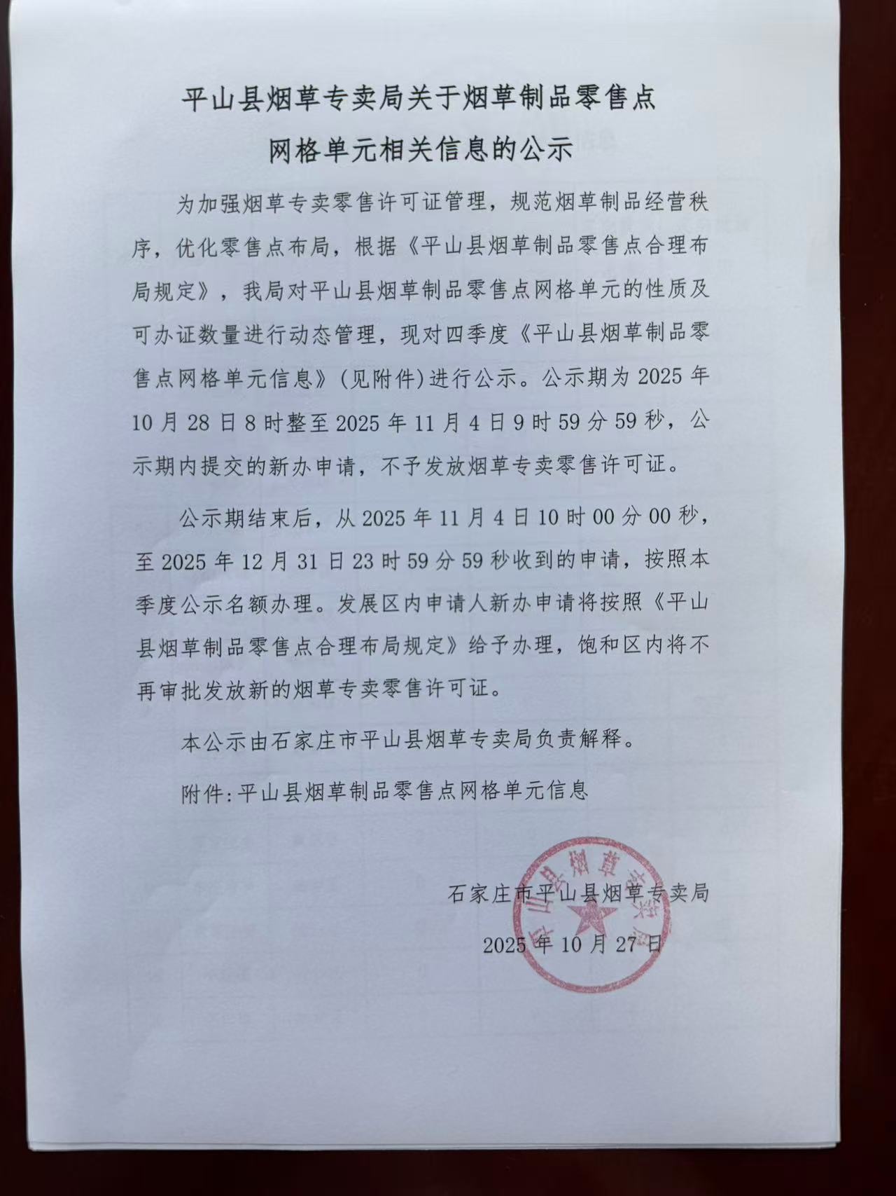 平山县烟草专卖局关于烟草制品零售点网格单元相关信息的公示