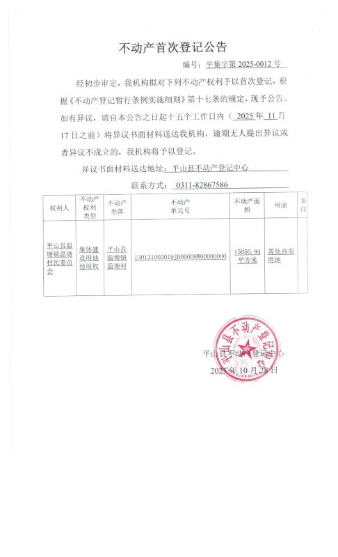 关于平山县温塘镇温塘村民委员会办理集体建设用地使用权首次登记公告
