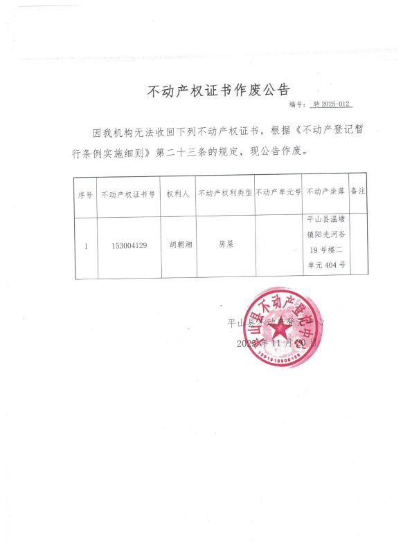 胡朝湘不动产权证书作废公告