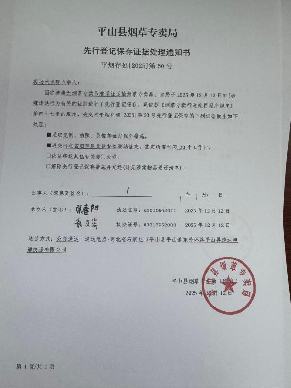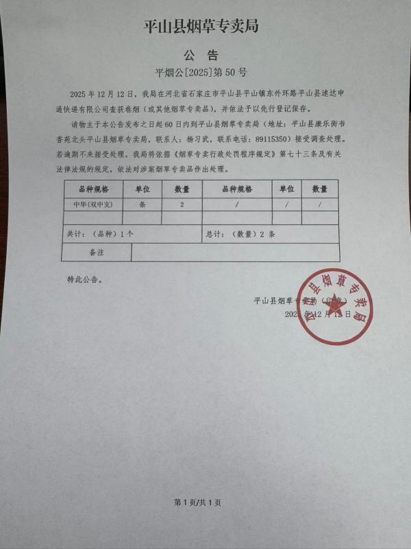 平山县烟草专卖局关于寻找当事人的公告(50号)