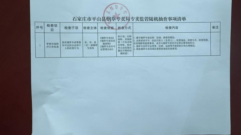 石家庄市平山县烟草专卖局专卖监管随机抽查事项清单