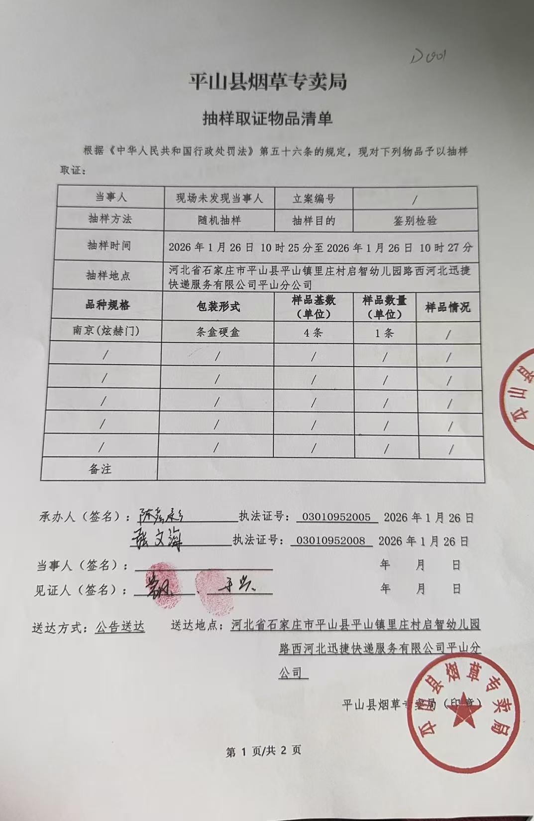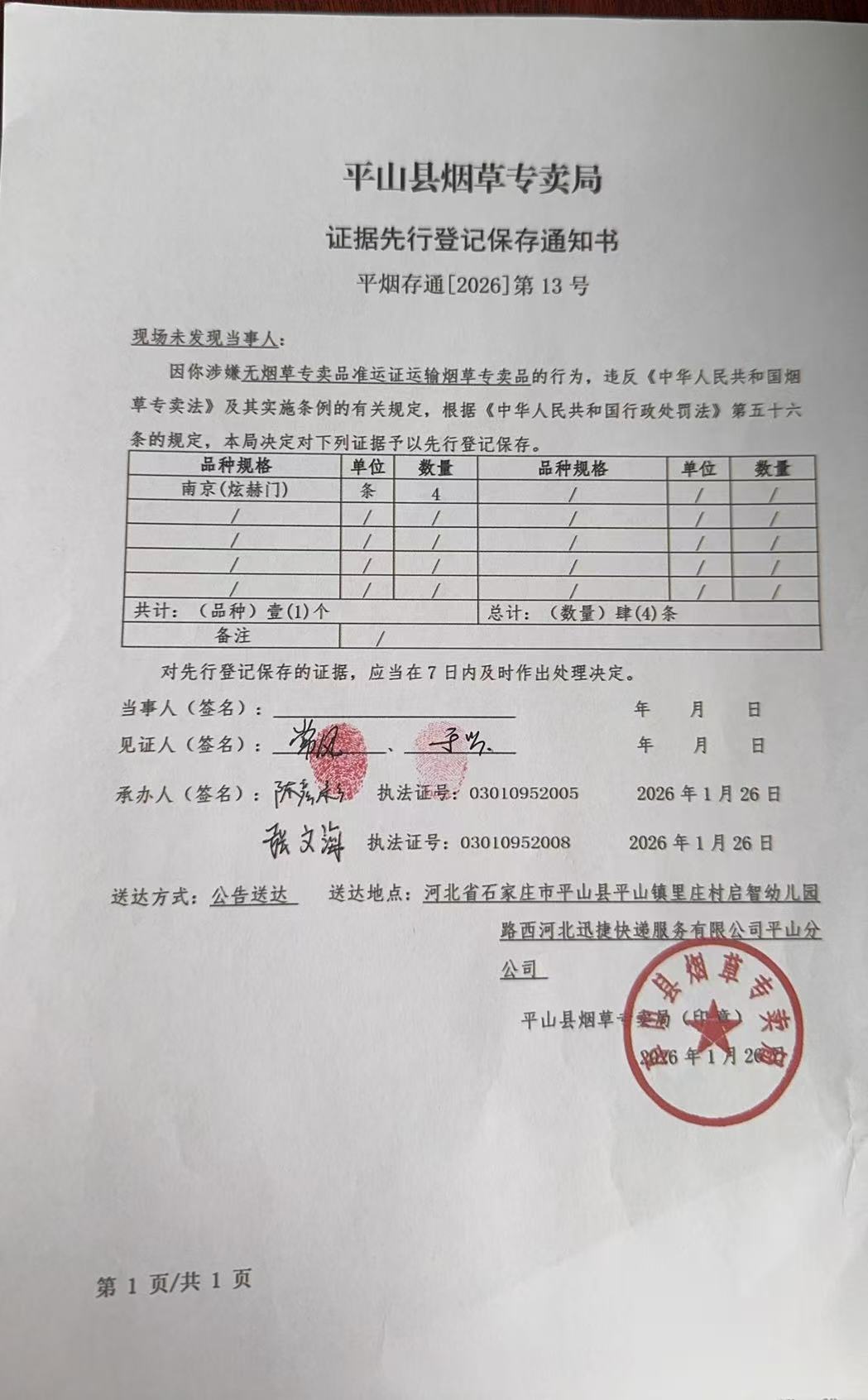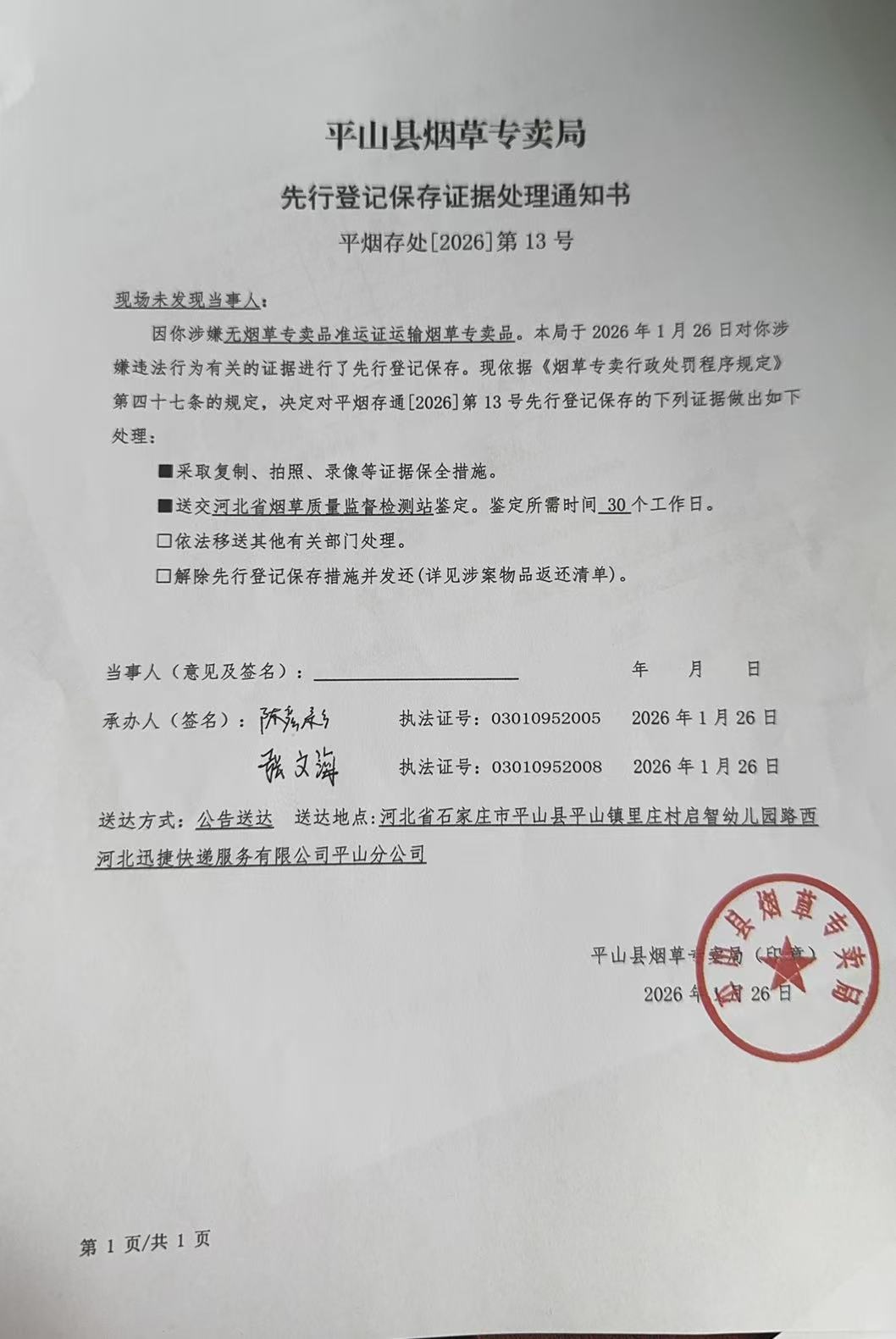 平山县烟草专卖局关于寻找当事人的公告