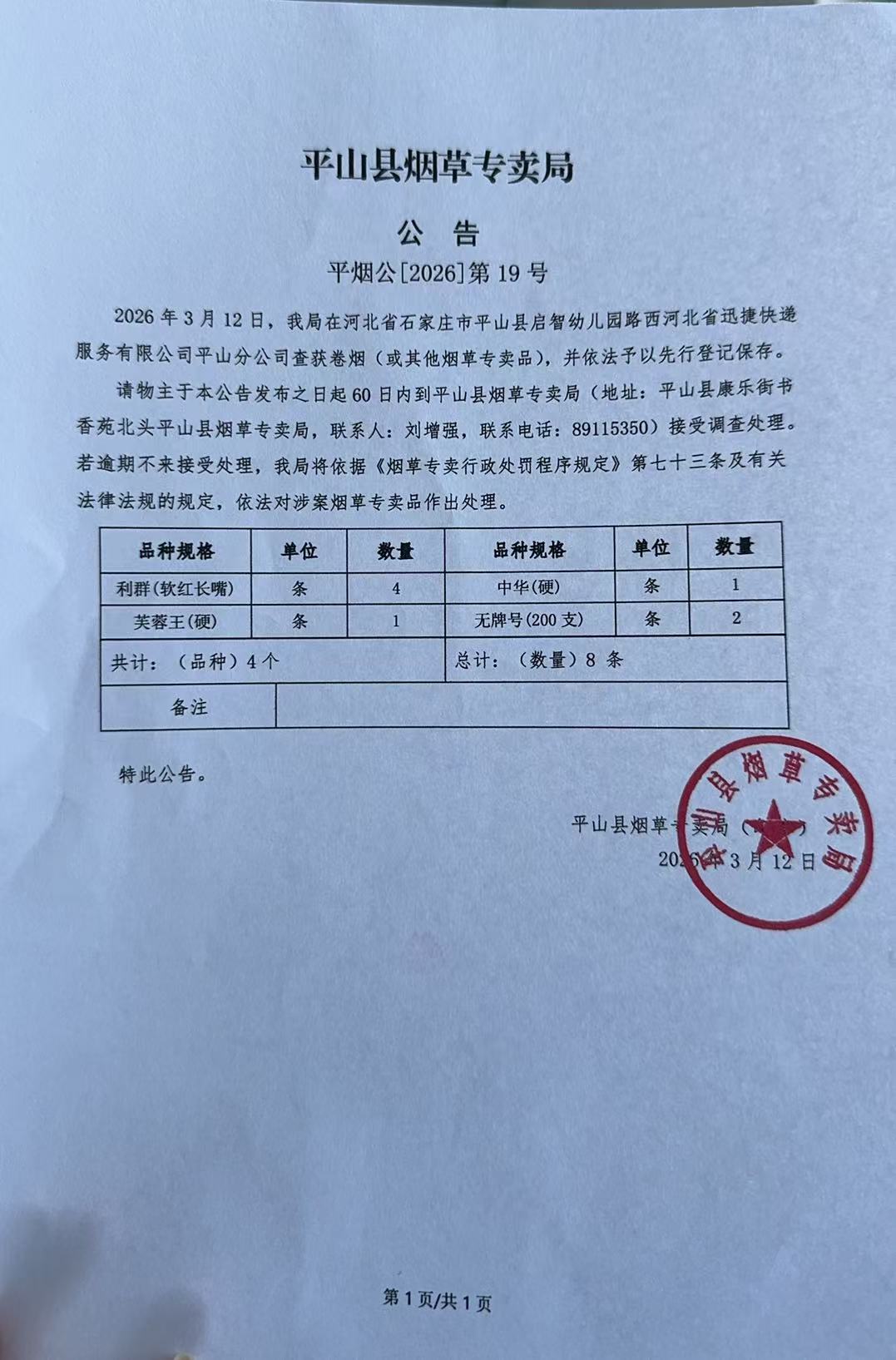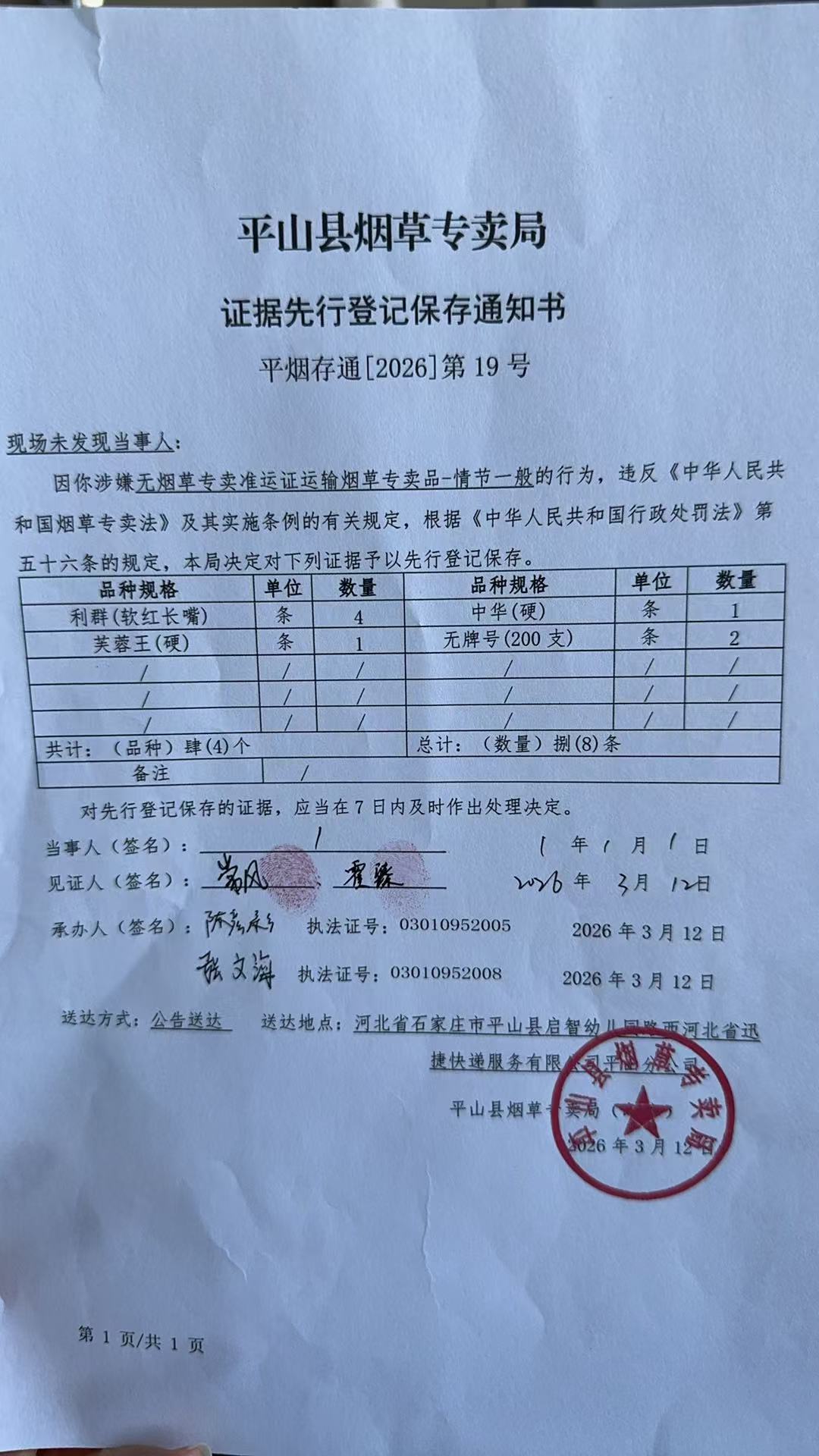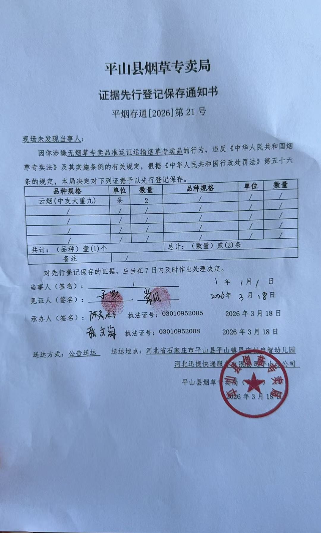平山县烟草专卖局关于寻找当事人的公告(19号、21号)