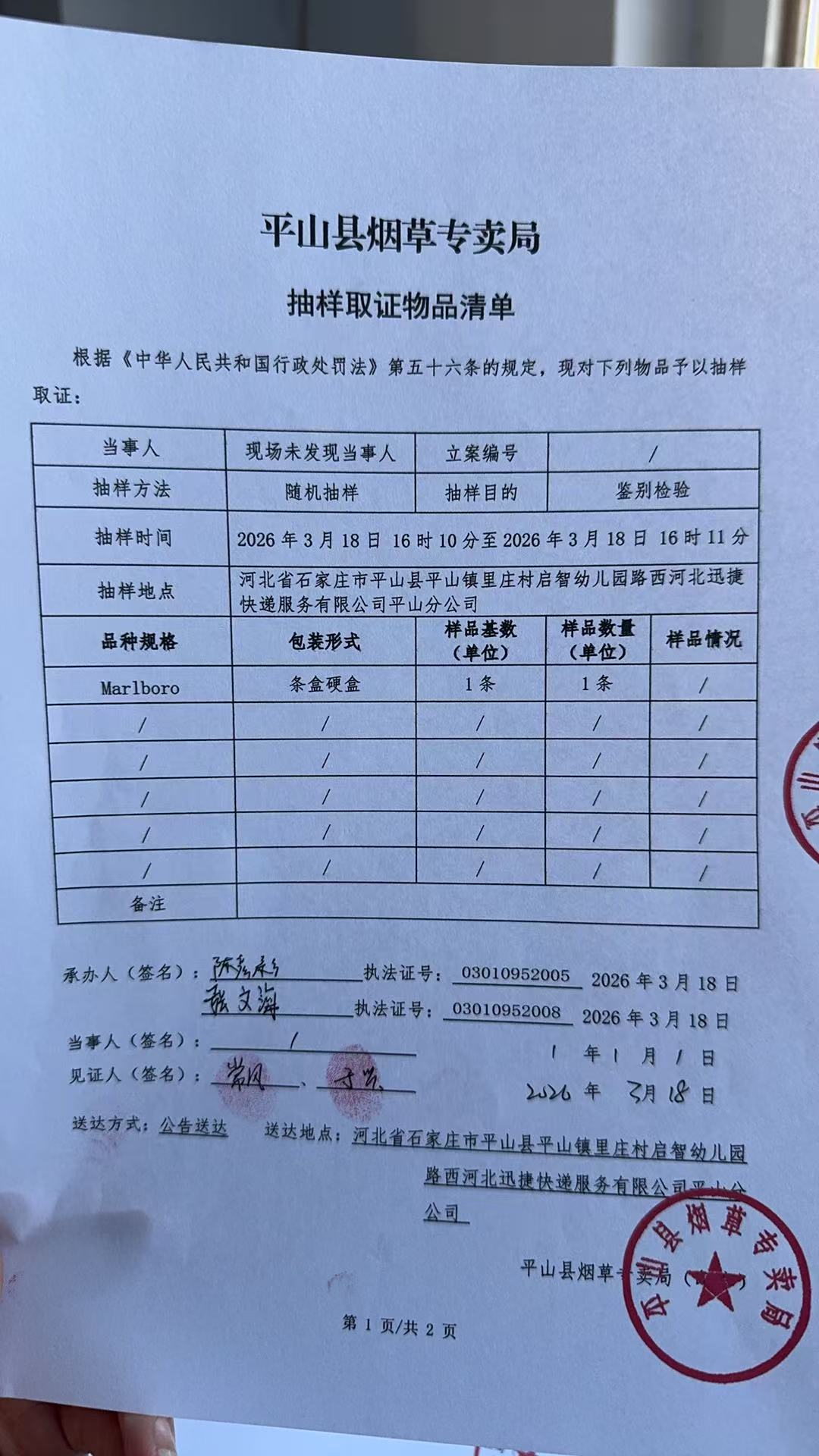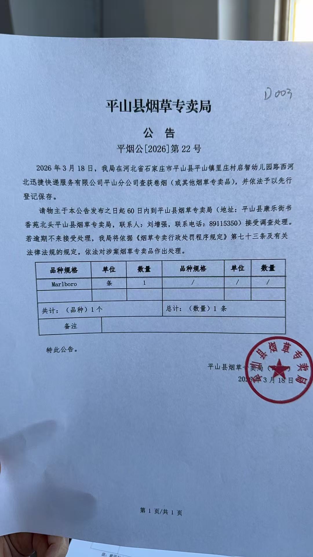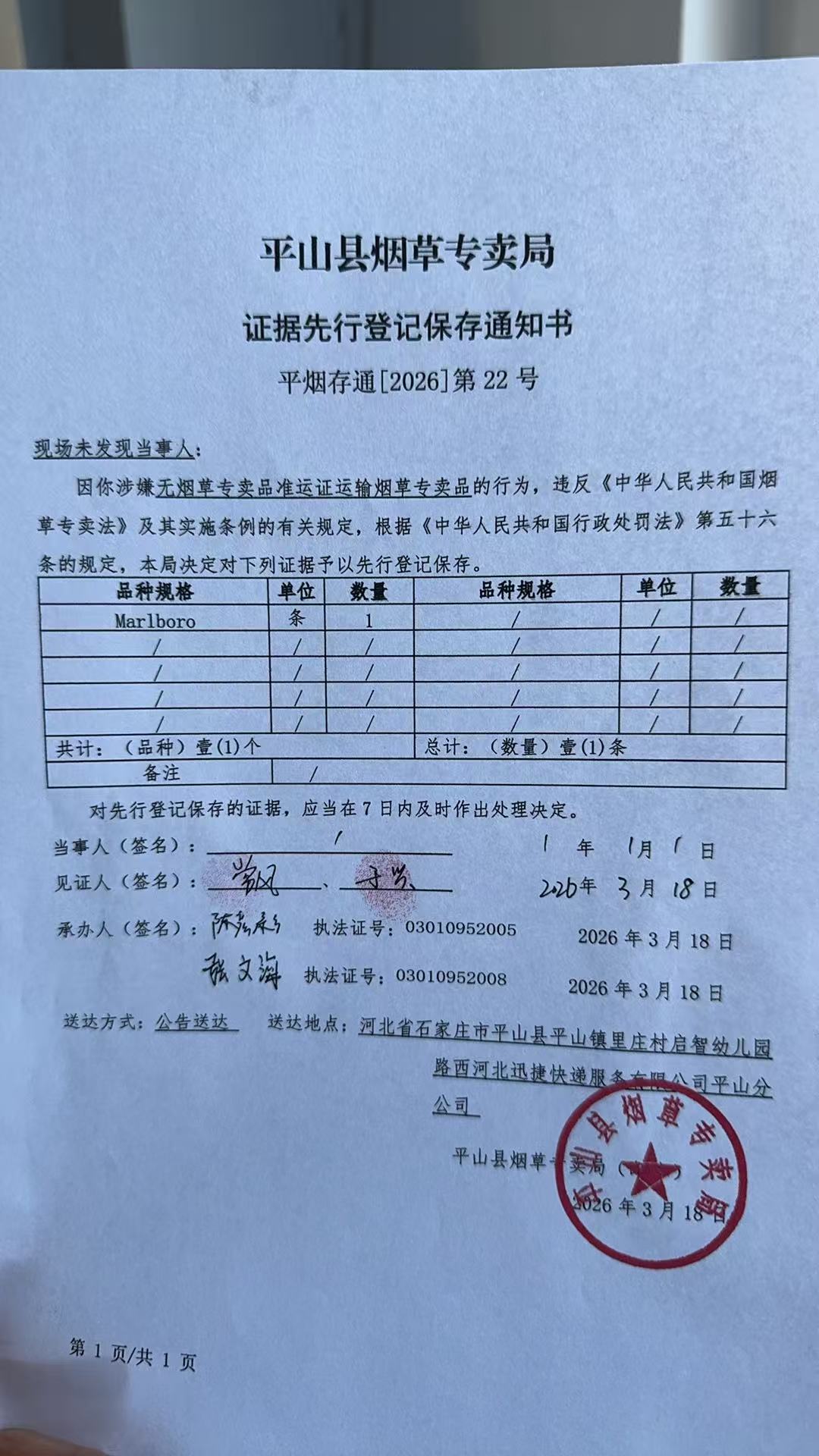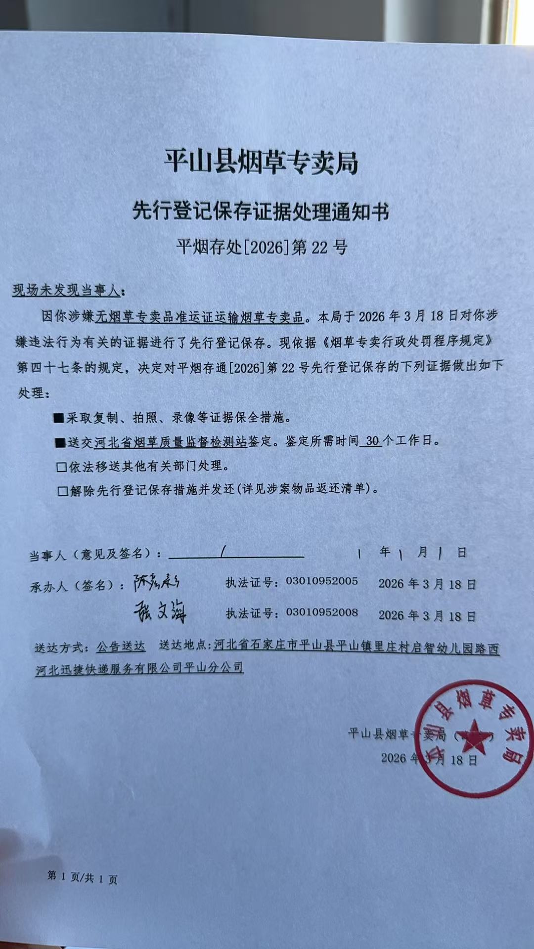 平山县烟草专卖局关于寻找当事人的公告(22号)