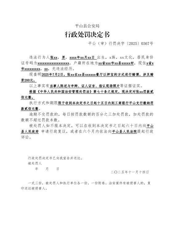 平公(审)行罚决字〔2025〕0367号行政处罚决定书
