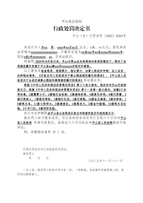 平公(关)行罚决字〔2025〕0384号行政处罚决定书