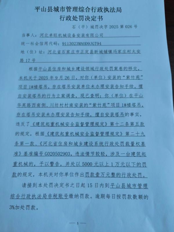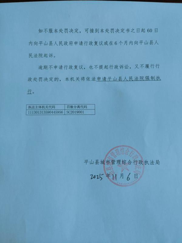 平山县城管局行政处罚决定书罚字【2025】第026号