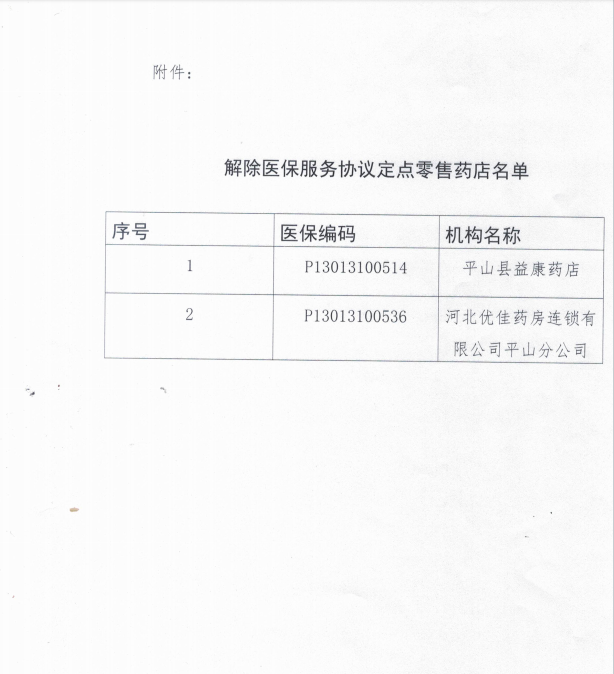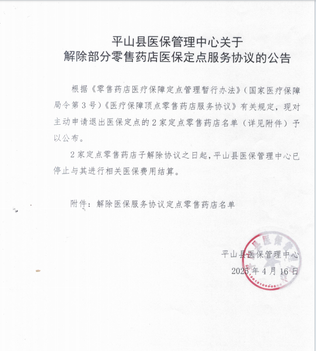 平山县医保管理中心关于解除部分零售药店医保定点服务协议的公告