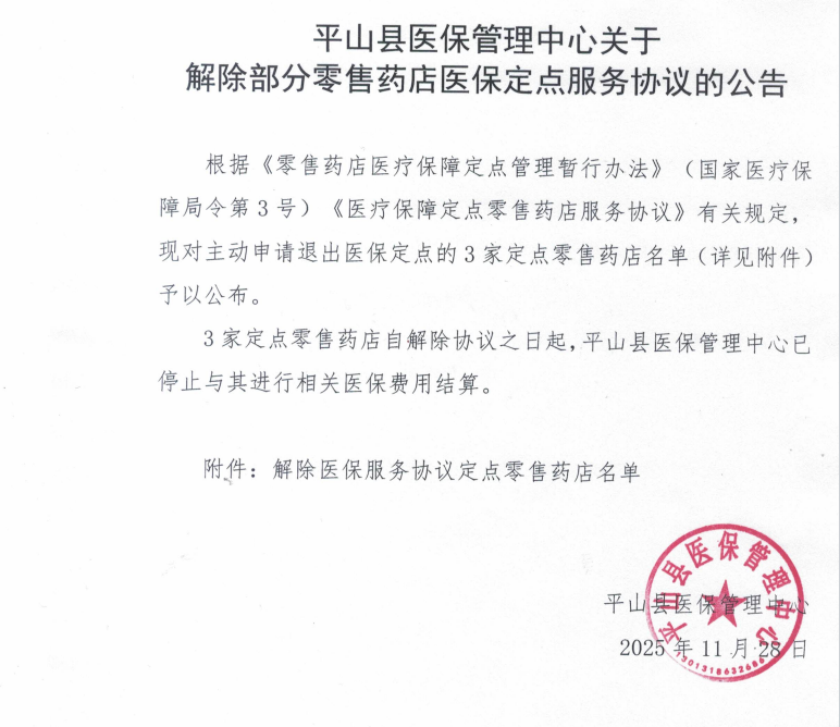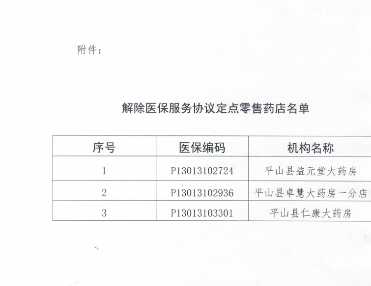平山县医保管理中心关于解除部分零售药店医保定点服务协议的公告
