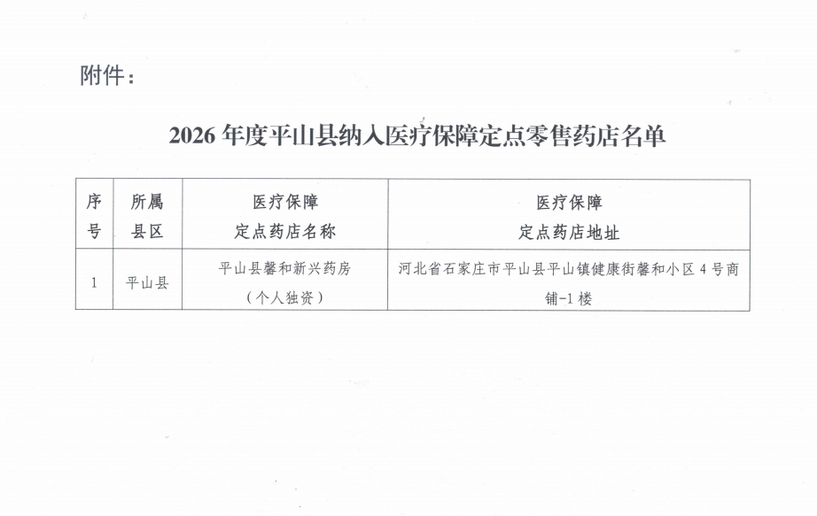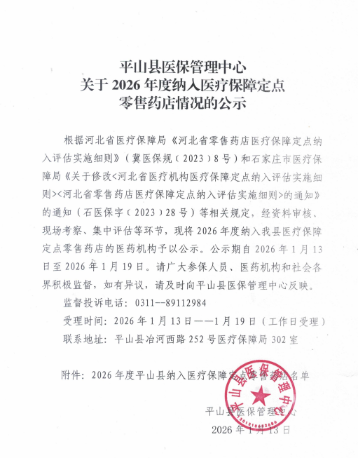 平山县医保管理中心关于2026年度纳入医疗保障定点零售药店情况的公示