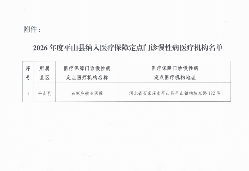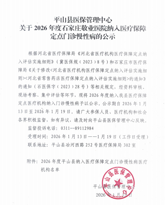 平山县医保管理中心关于2026年度石家庄敬业医院纳入医疗保障定点门诊慢性病的公示
