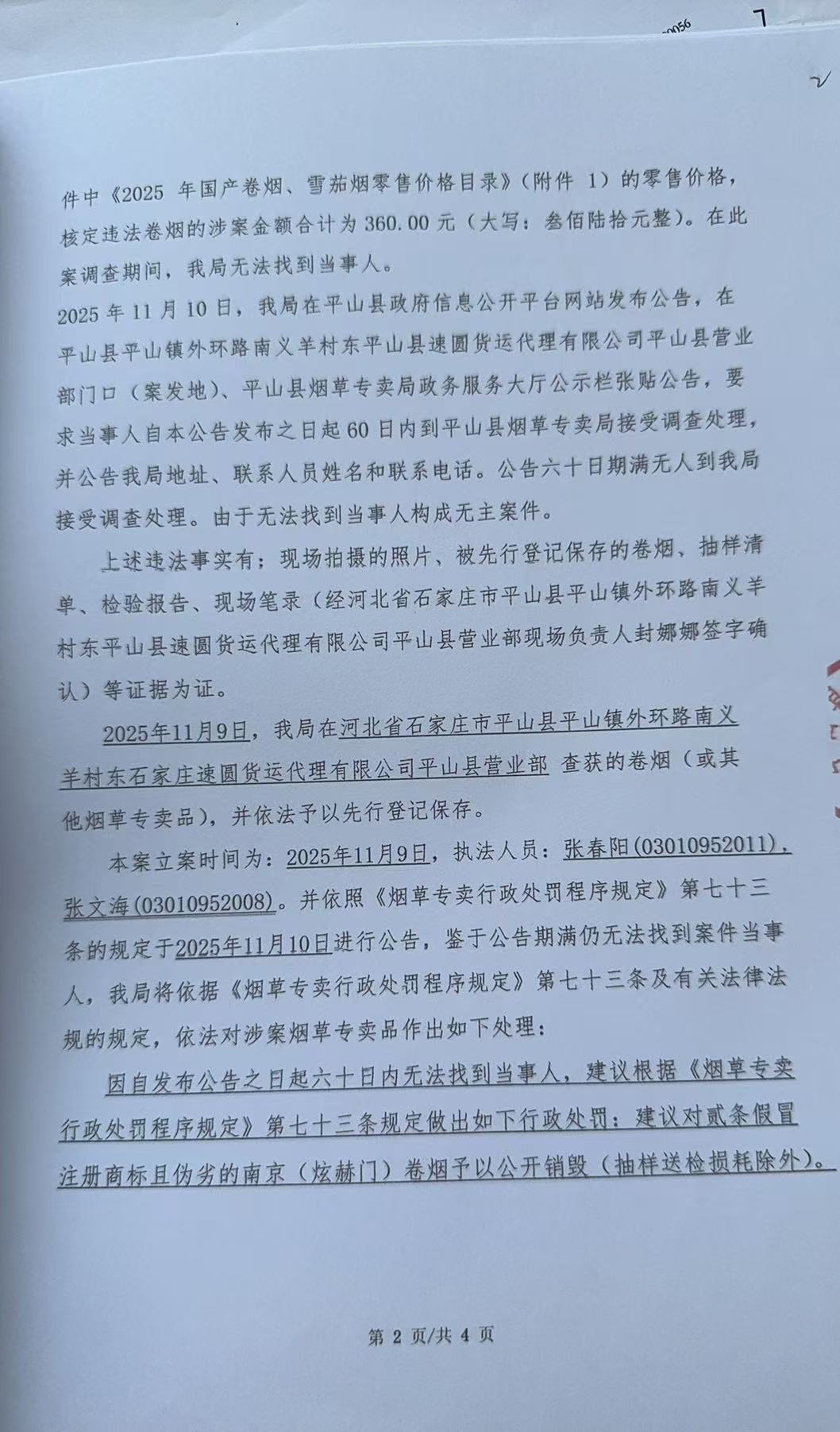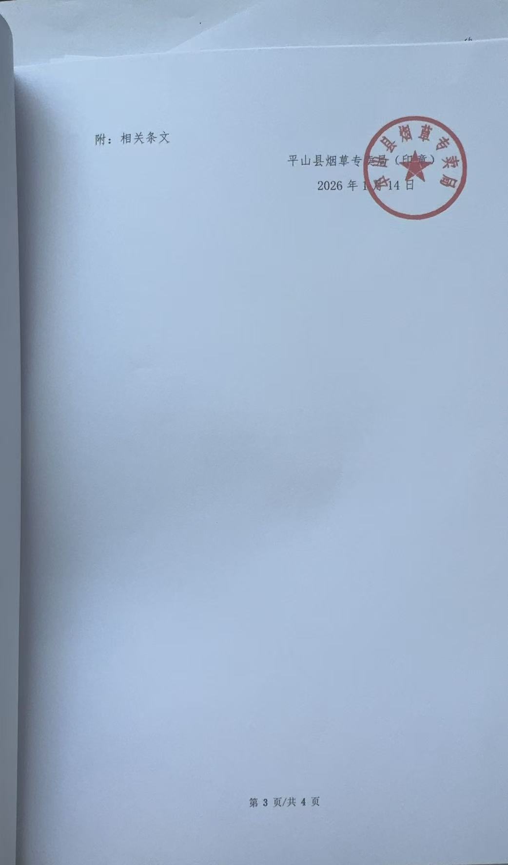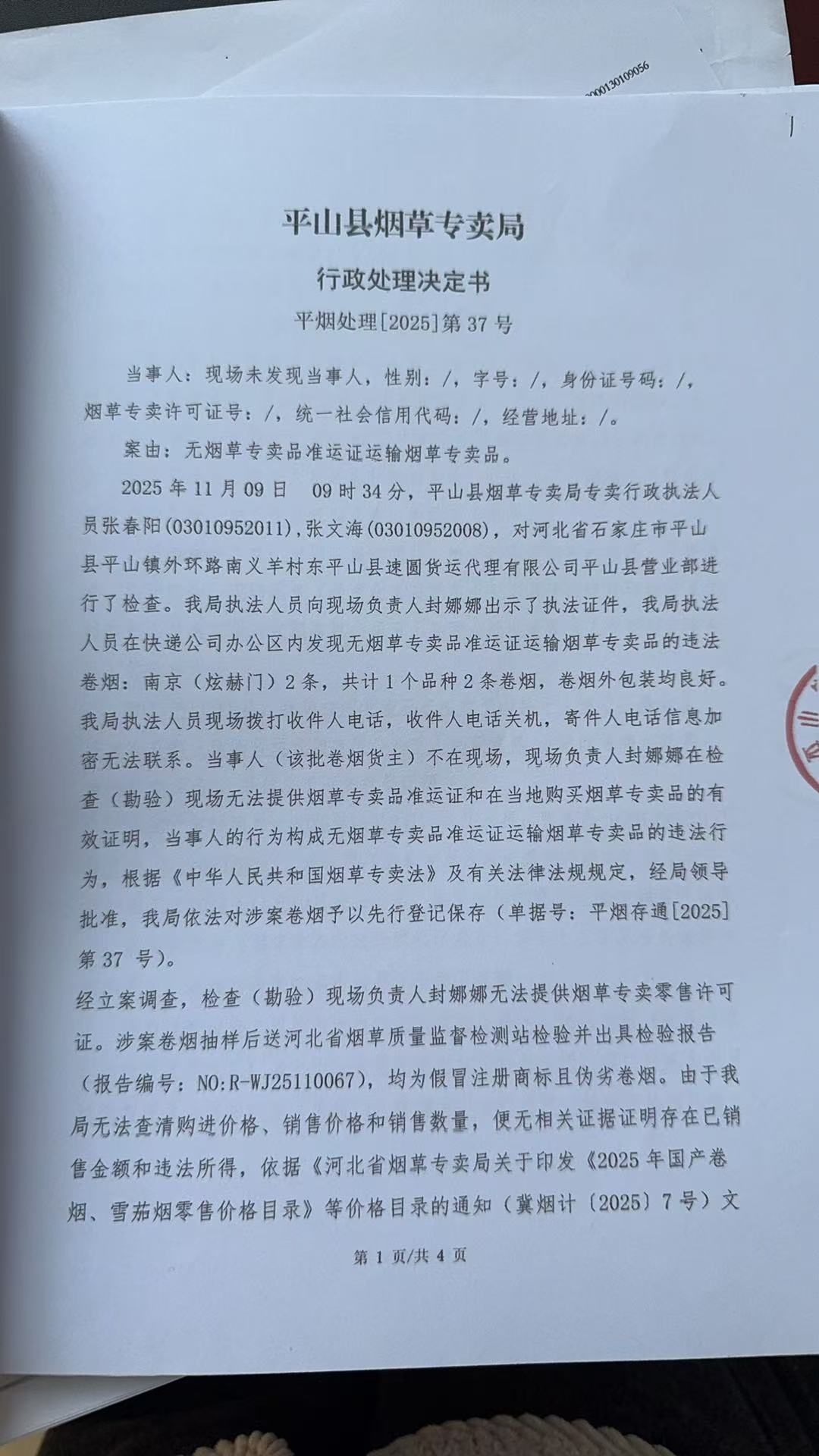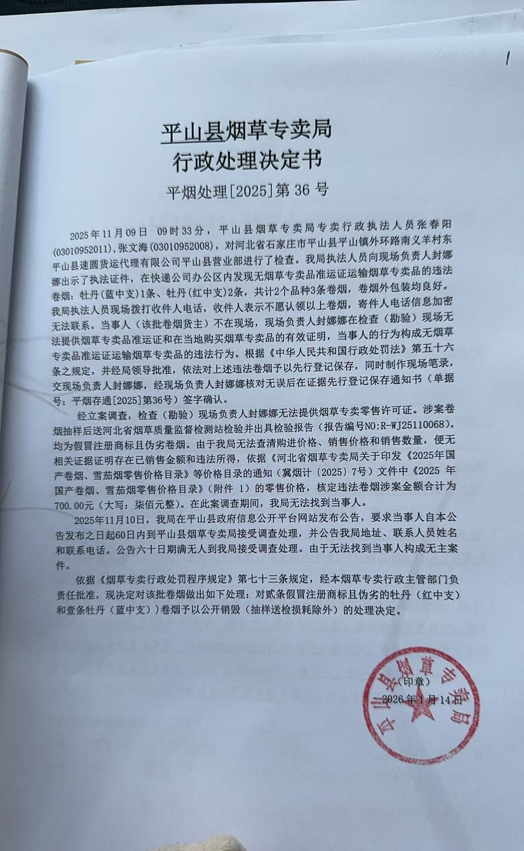 平山县烟草专卖局关于行政处理决定书的公示(2025年度平烟第36、37号)