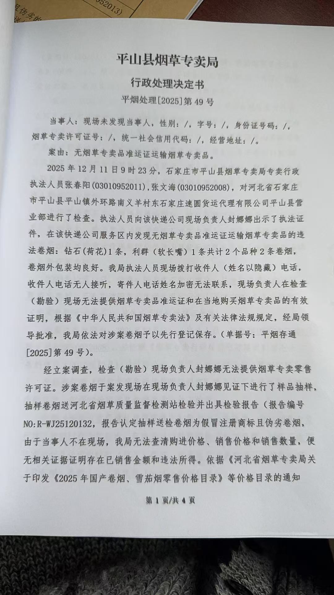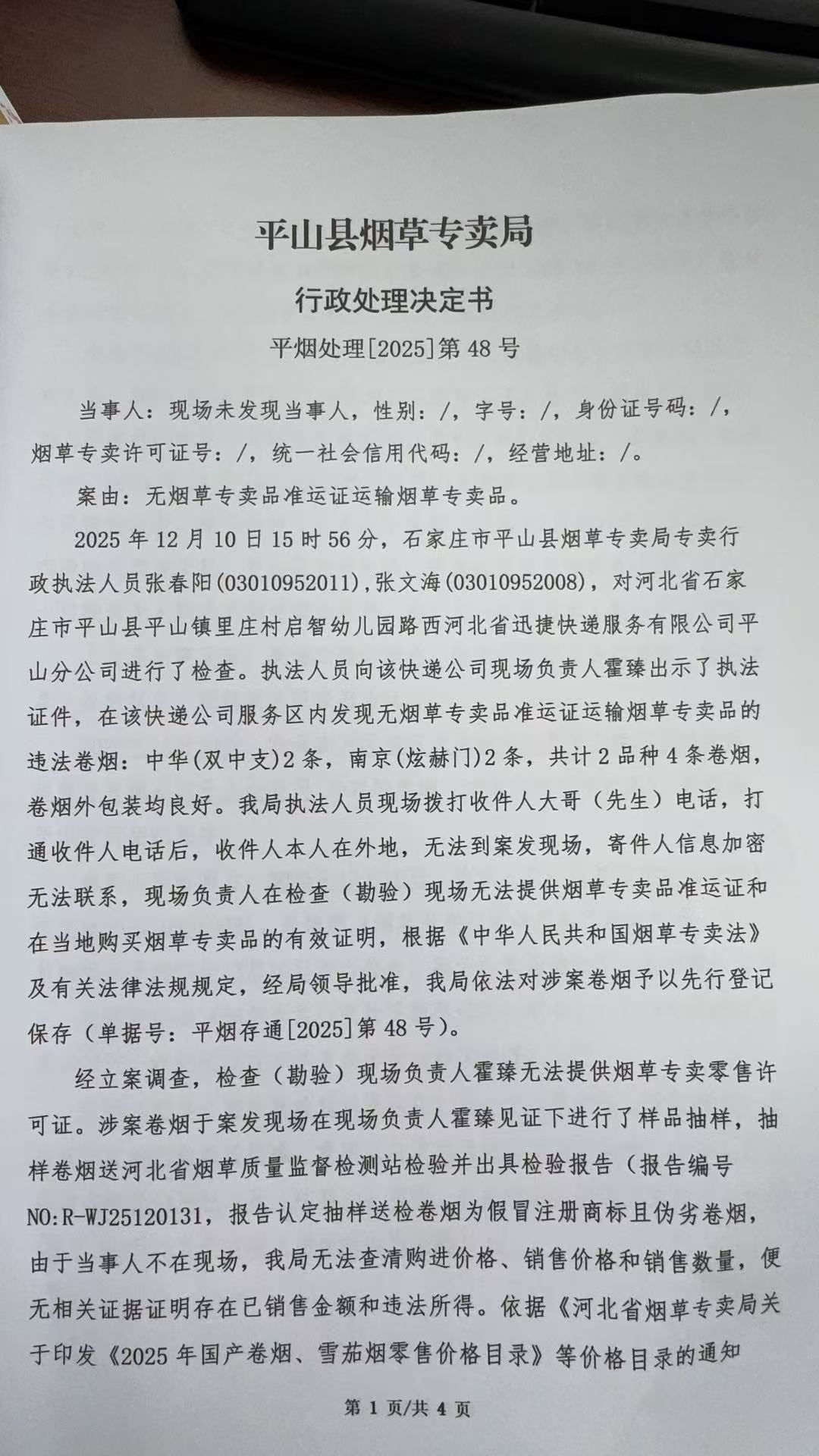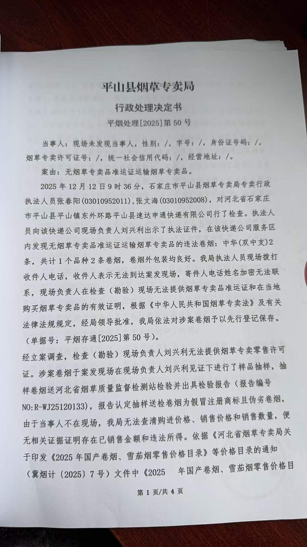 平山县烟草专卖局关于行政处理决定书的公示 平烟处理[2025]第48号、第49号、第50号