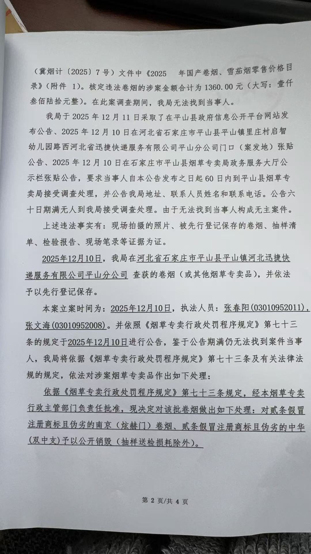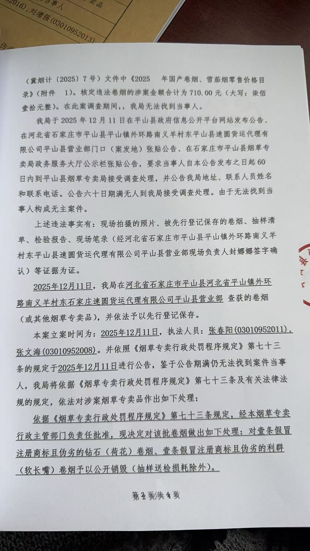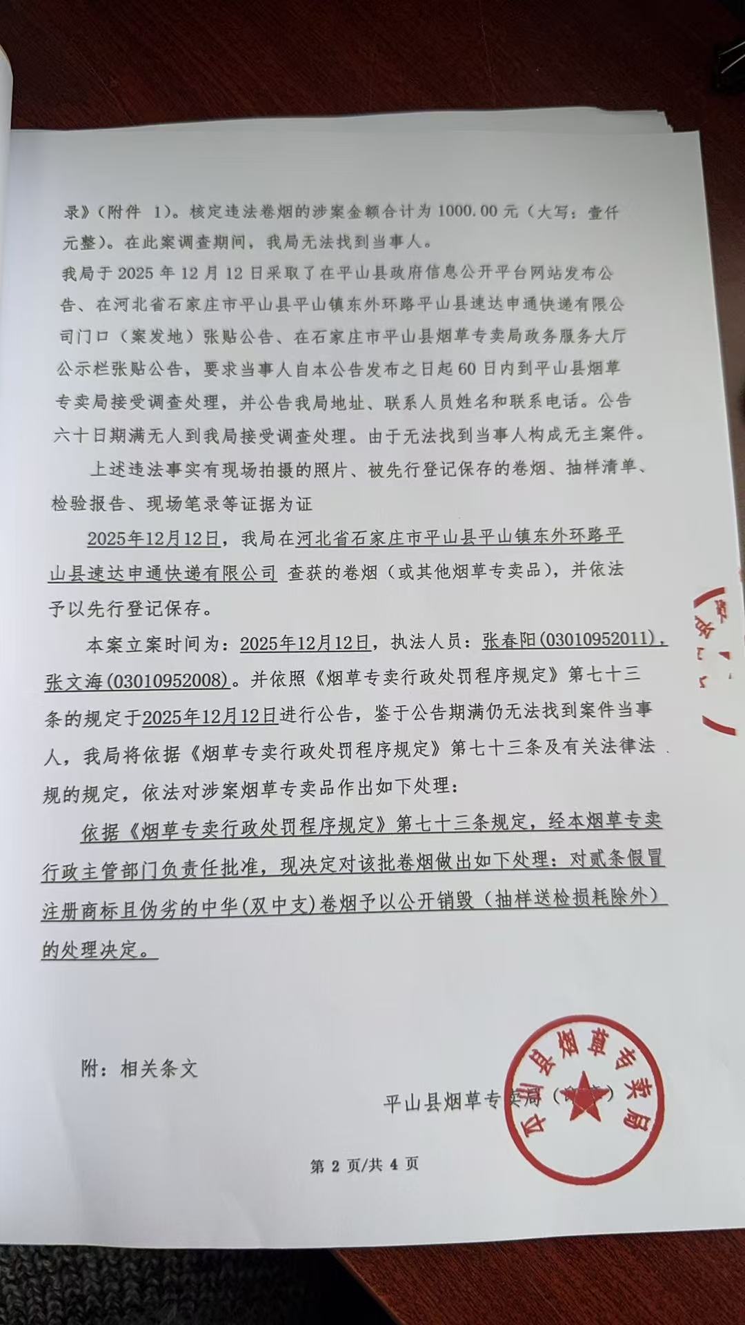 平山县烟草专卖局关于行政处理决定书的公示 平烟处理[2025]第48号、第49号、第50号